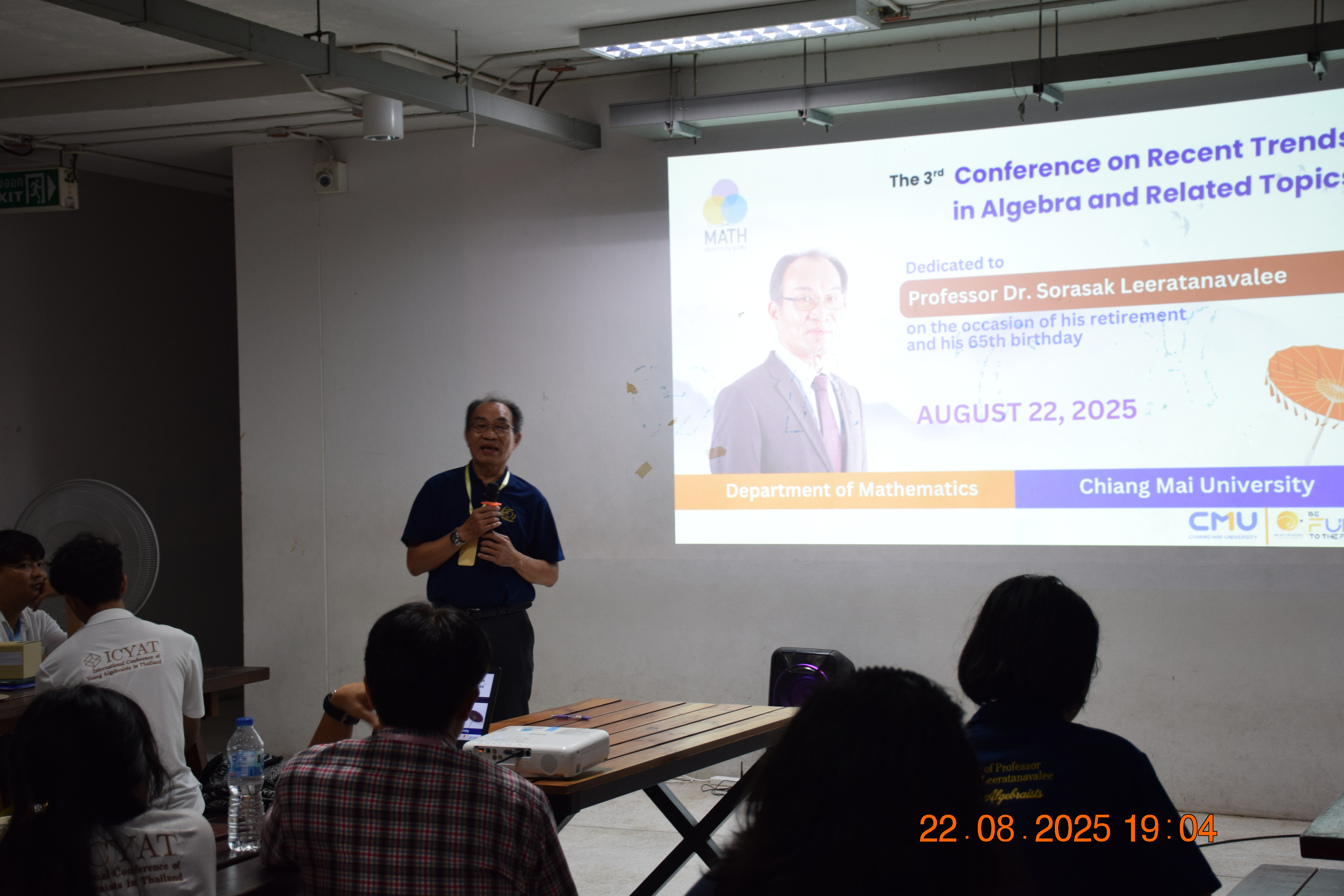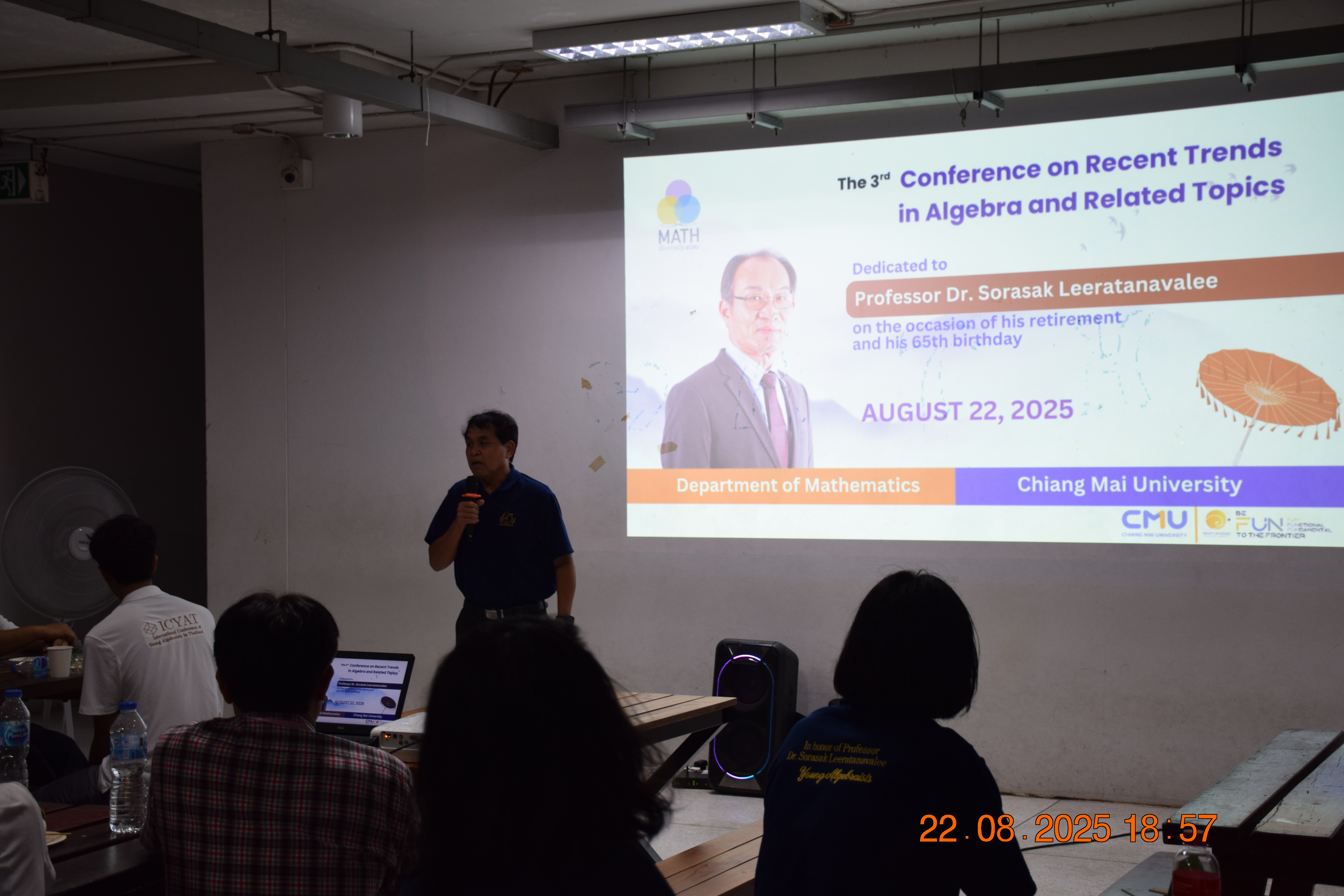 มื่อวันศุกร์ที่ 22 สิงหาคม 2568 ภาควิชาคณิตศาสตร์ได้จัดการประชุมวิชาการ The 3rd Conference on Recent Trends in Algebra and Related Topics ณ ภาควิชาคณิตศาสตร์ โดยการประชุมครั้งนี้จัดขึ้นเพื่อเชิดชูเกียรติ ศาสตราจารย์ ดร.สรศักดิ์ ลี้รัตนาวลี เนื่องในโอกาสเกษียณอายุราชการและครบรอบวันคล้ายวันเกิด 65 ปี
