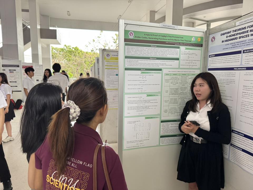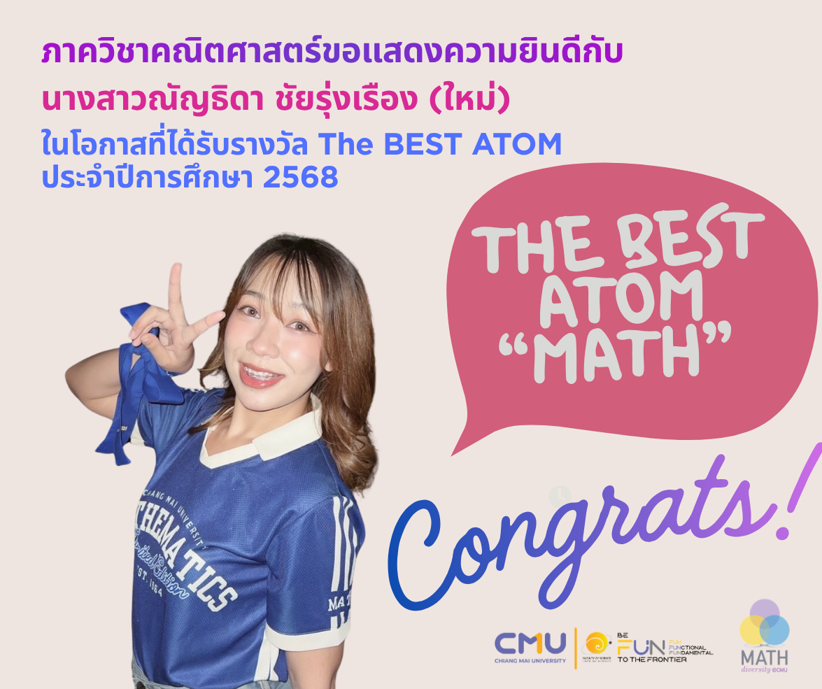 ภาควิชาคณิตศาสตร์ คณะวิทยาศาสตร์ มหาวิทยาลัยเชียงใหม่ ขอแสดงความยินดีกับนักศึกษาชั้นปีที่ 4 ทุกคน ที่ได้เข้าร่วมนำเสนอผลงานวิชาการในครั้งนี้ และขอแสดงความยินดีกับนักศึกษาที่ได้รับรางวัลจากการนำเสนอผลงาน